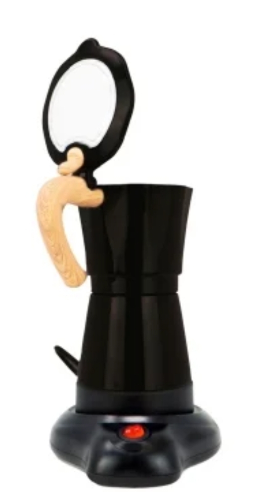 Disfruta del café italiano con la Jocca 2498. Cafetera moka eléctrica de diseño elegante en negro y madera. ¡Ideal para oficina y hogar sin fogones!